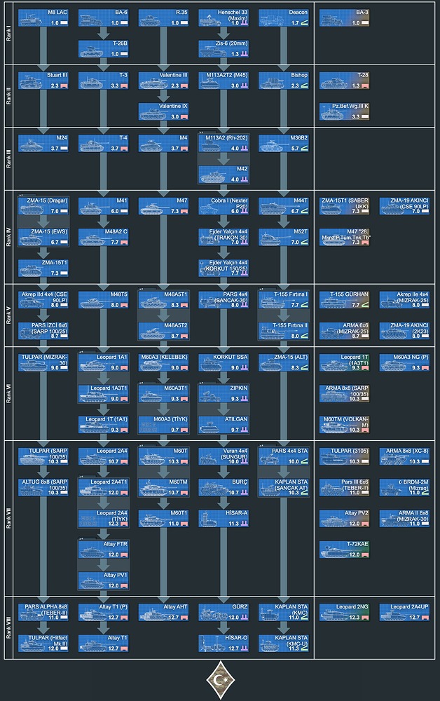 For the time being, tech tree starts from Rank IV, much like Israeli counterpart, and has vehicles all the way down to the Rank VII and we have plans to move some vehicles up to Rank VIII once Gaijin introduces Rank VIII to Ground Forces. You should note that, tech tree is not finalised yet, some vehicles might be added, removed or moved within tech tree. Also more important note, take the BR arrangement of the vehicles with a grain (maybe with a pack ? lol) of salt since some of those vehicles are pretty modern machines and their specifications are classified (do not worry I’m not willing to leak any documents) or do not have proper counterparts to decide fitting BR. You are very welcomed to states your opinion about BRs of vehicles as well as overall Tech Tree.