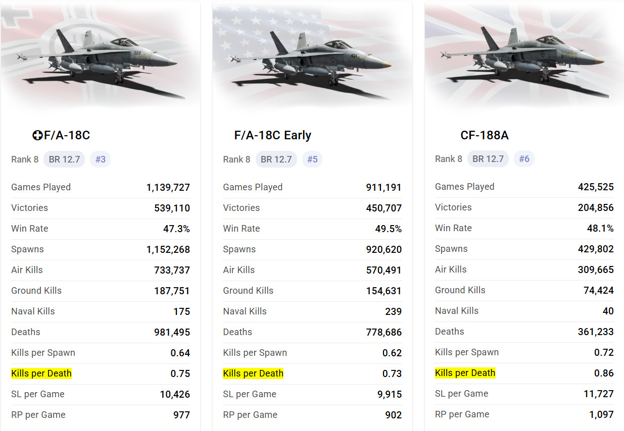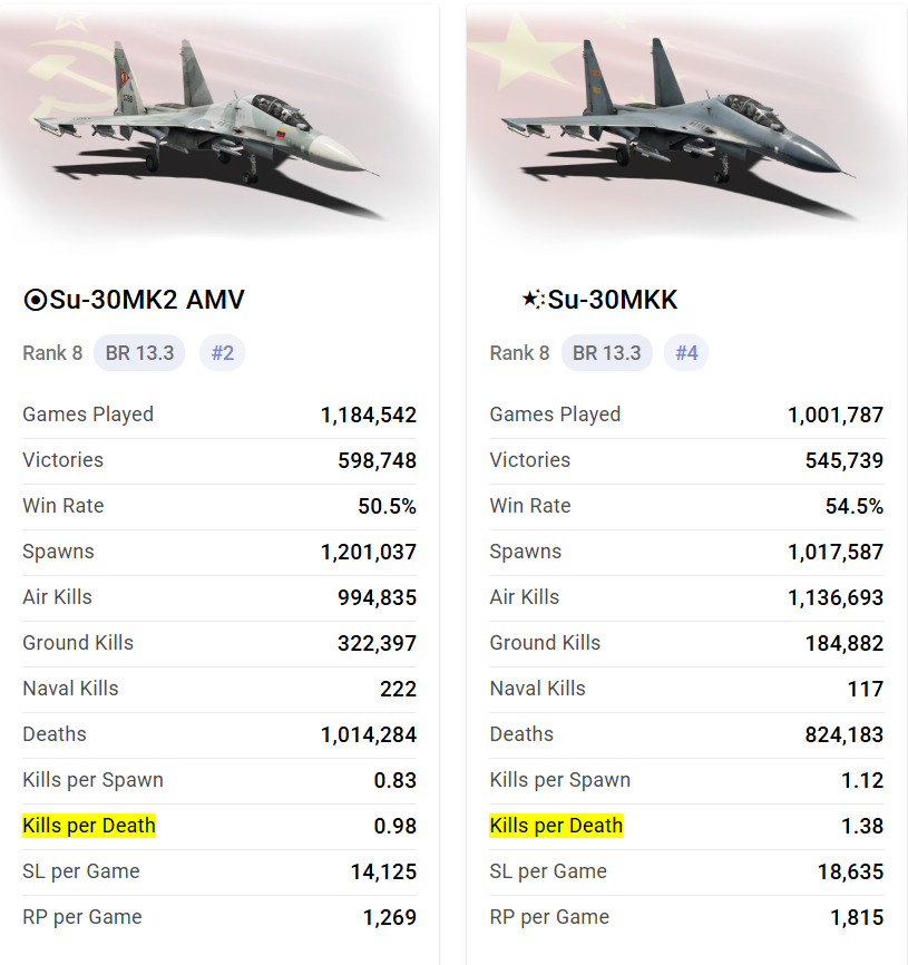 Problem #3: premium spam creates a Black Hole effect where they affect each other. Premium Hornets are being sucked into the Su-30MK2/MKK games where they pose little to no opposition as evidenced by the stats: