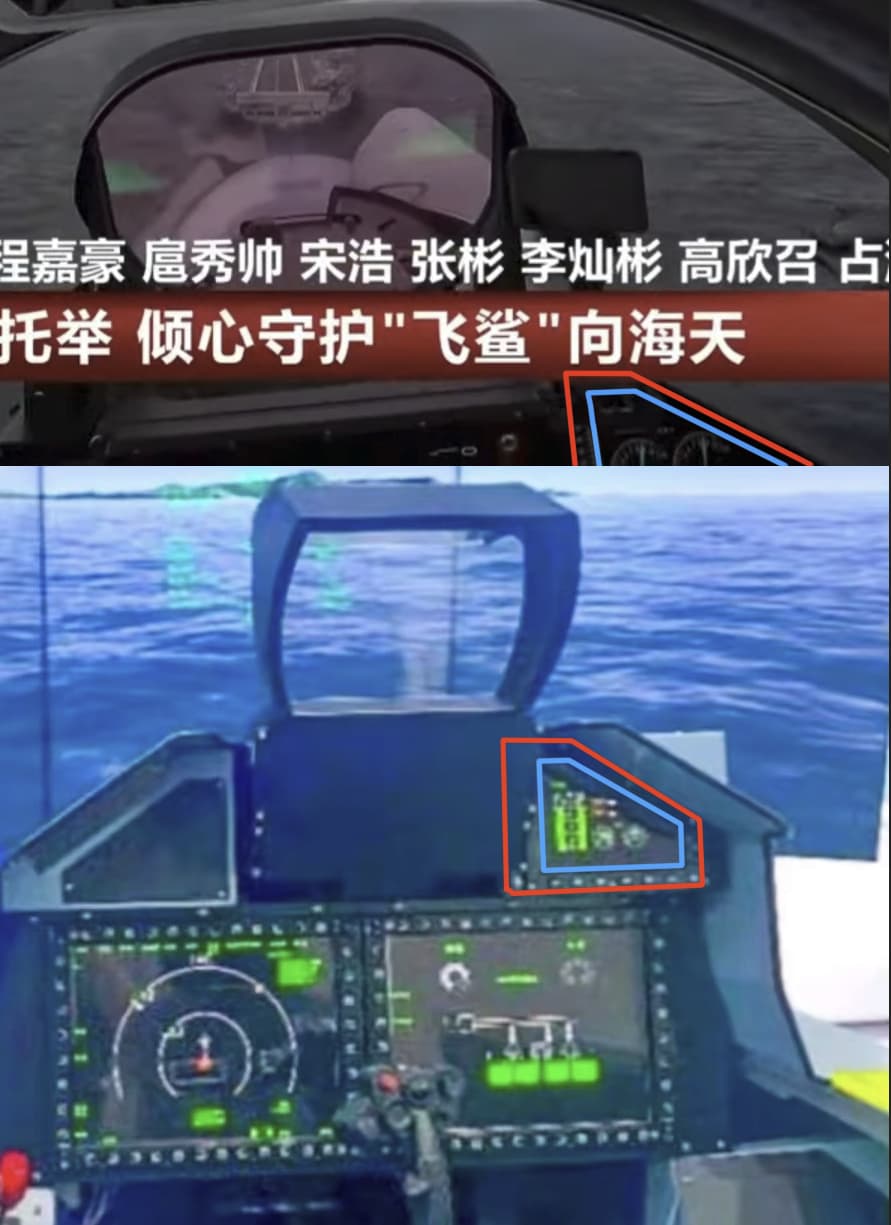 从现有资料看,J-15T的座舱与J-16的关系远远大于与J-11B的关系,J-15T不仅控制面板是J-16同款,座舱多处特征也与J-16相吻合,可以推断出J-15T的航电是基于J-16发展出来的,图里能看到模糊的屏幕和按钮,也和J-16的双屏布局特征对得上。