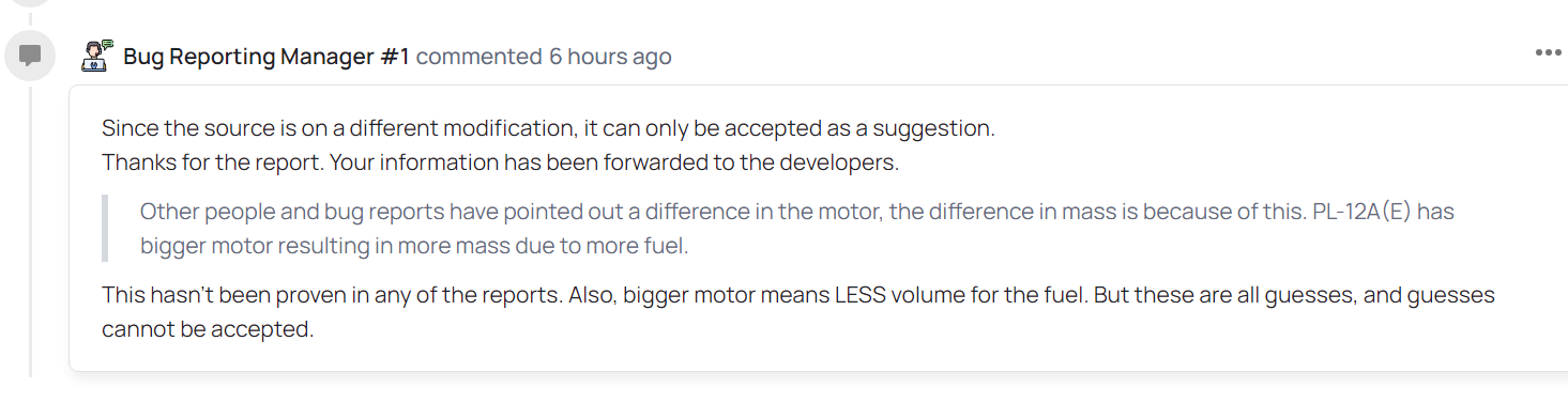 回复中引用部分是报告者的原话,即“霹雳-12AE 发动机和燃料重量更高所以导致霹雳-12AE 的质量大于霹雳-12”,cbr 平台管理员的意思是否决这一猜测,因为没有交叉报告可供证明,但前提仍然是霹雳-12AE 的数据不能直接套用至霹雳-12A