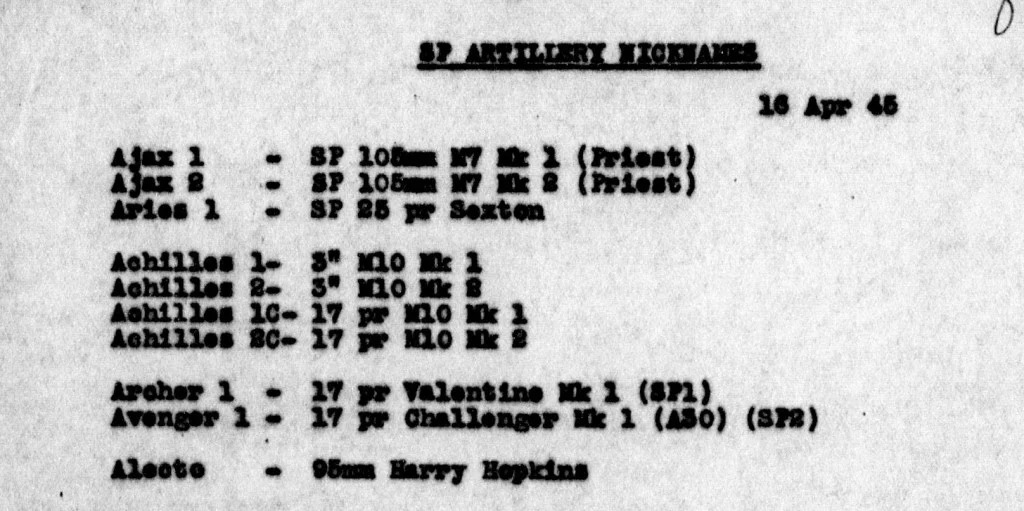 The Anti-Tank Regiments of the Assault Divisions were equipped with a single SP Troop of four vehicles in each of their four Batteries for 16 SPs per Regiment, while the Anti-Tank Regiments in the Armoured Divisions and Corps Troops were equipped with two full SP Batteries for a total of 24 SPs per Regiment.