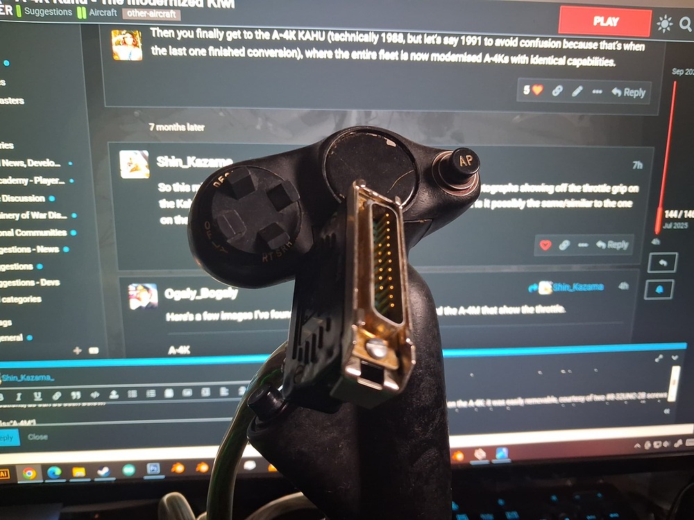 Fun fact about the throttle grip on the A-4K: it was easily removable, courtesy of two #8-32UNC-2B screws and a simple DB25 connector on the underside. In fact, KAHU seemed to have something of an affinity for the DB25 connector - not only was it used on the throttle, but it was also used as the primary interface between the KAHU avionics test computers and the desktop-mounted stick that attached to it.