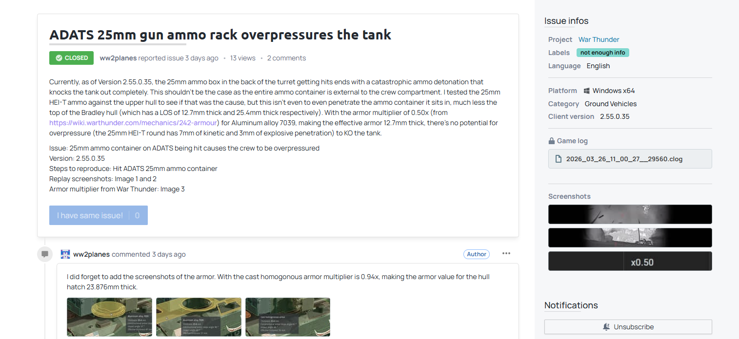 Can I get a response to that? I’ve had multiple bug reports blown off even though I’ve given literal tech manual sources with screenshots, unedited in game screenshots from the War Thunder screen shot file for others, etc and been told to effectively bugger off and now been banned from the report website twice because… reasons?