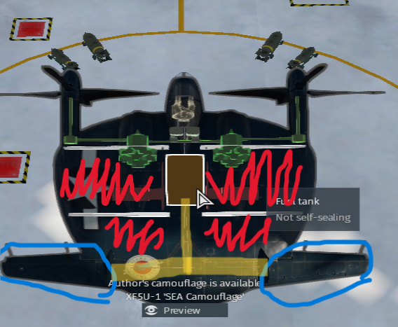 But the main weakpot of this plane are the “elevons” encircled in blue, losing one means the XF5U-1 can’t pitch up anymore without rolling and pointing it’s nose down.