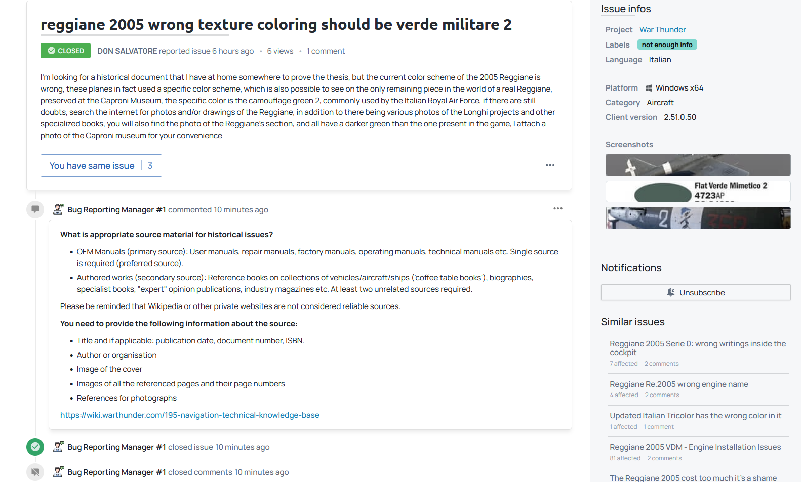 Riassunto breve, mi ritengo cmq un idiota io stesso, il bug report che come era prevedibile è stato appena cestinato mostrava che la colorazione del reggiane e anche quella di molti altri aerei italiani del resto è sbagliata, è un colore verde pozzanghera quando dovrebbe essere verde oliva scuro