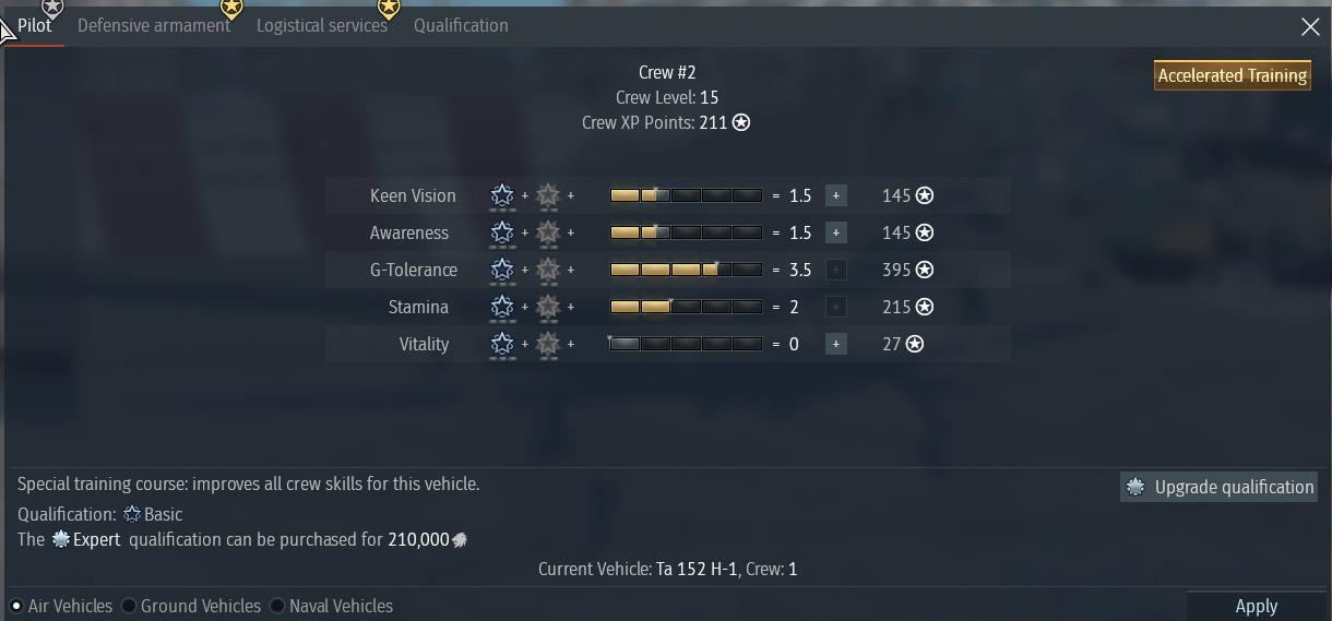 That is your Ta-152 crew. You have 211 xp and level 15. The last 3 steps of g-tolerance did cost you 820 xp. That makes for 1031 xp that you could have spend on vitality, defensive armamets or logistical services to level up to 20.