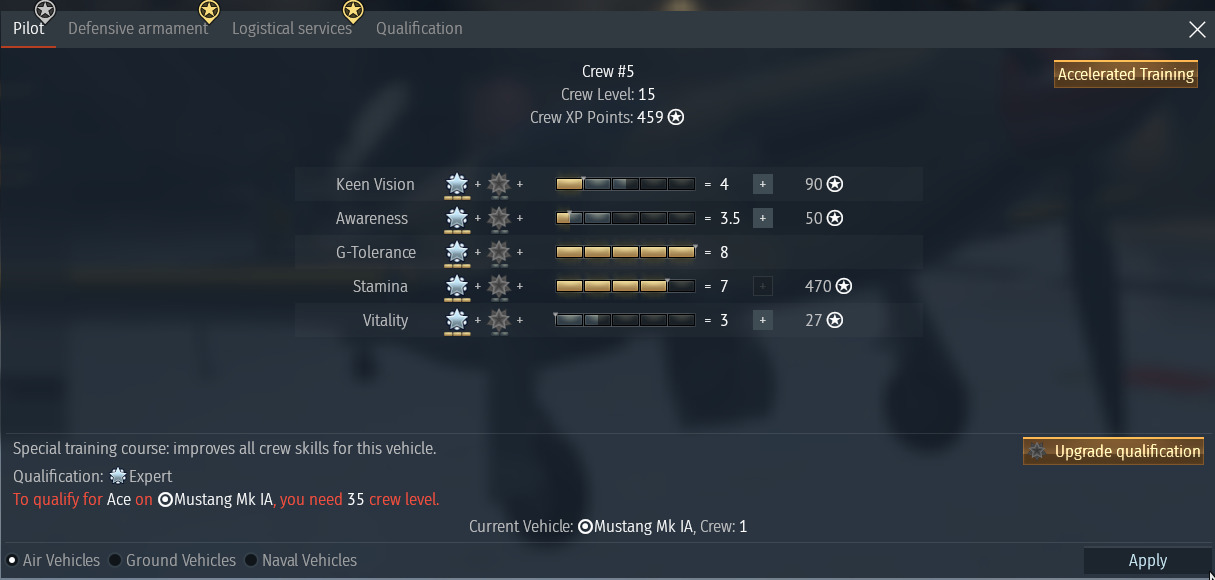 For this, I cite the Yak example: Expert alone is insufficient to maintain parity with a full crew (Bf 109F4). A 5/5 expert allows you to violate human physiology and do superhuman feats with aircraft (the amount of time the 109F4 spent over 7G and even 6G is ridiculous in a WW2 context).