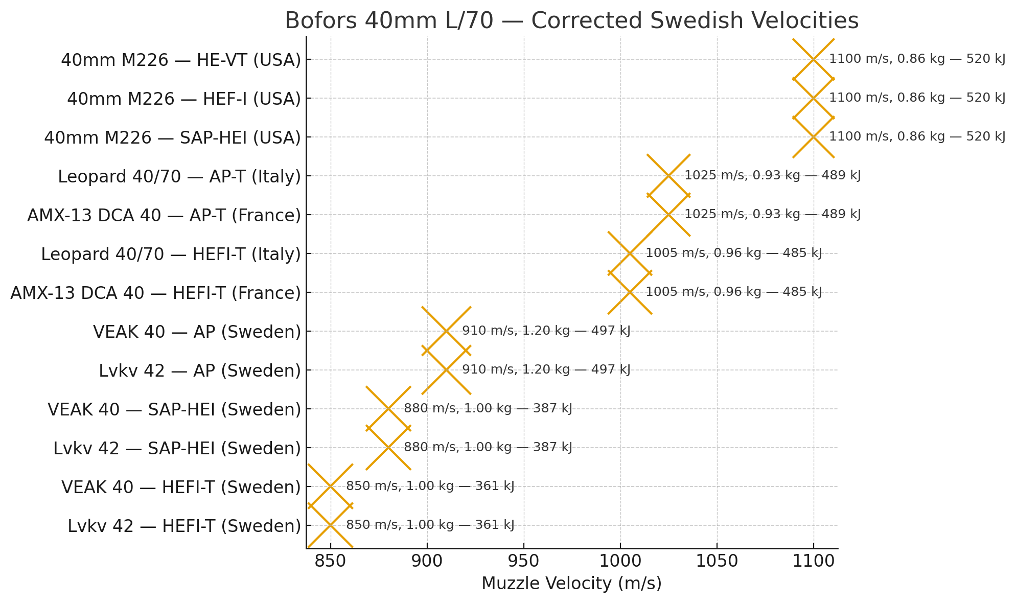 Hello. I was comparing the bullet velocities of the Lvkv9040C and the M247 VT, and the Lvkv9040C’s bullet velocity was 1015 m/s, while the M247’s was 1100 m/s. Why is this? Both are equipped with a 40mm Bofors L/70 cannon. Is it because they use different ammunition? Can someone explain?