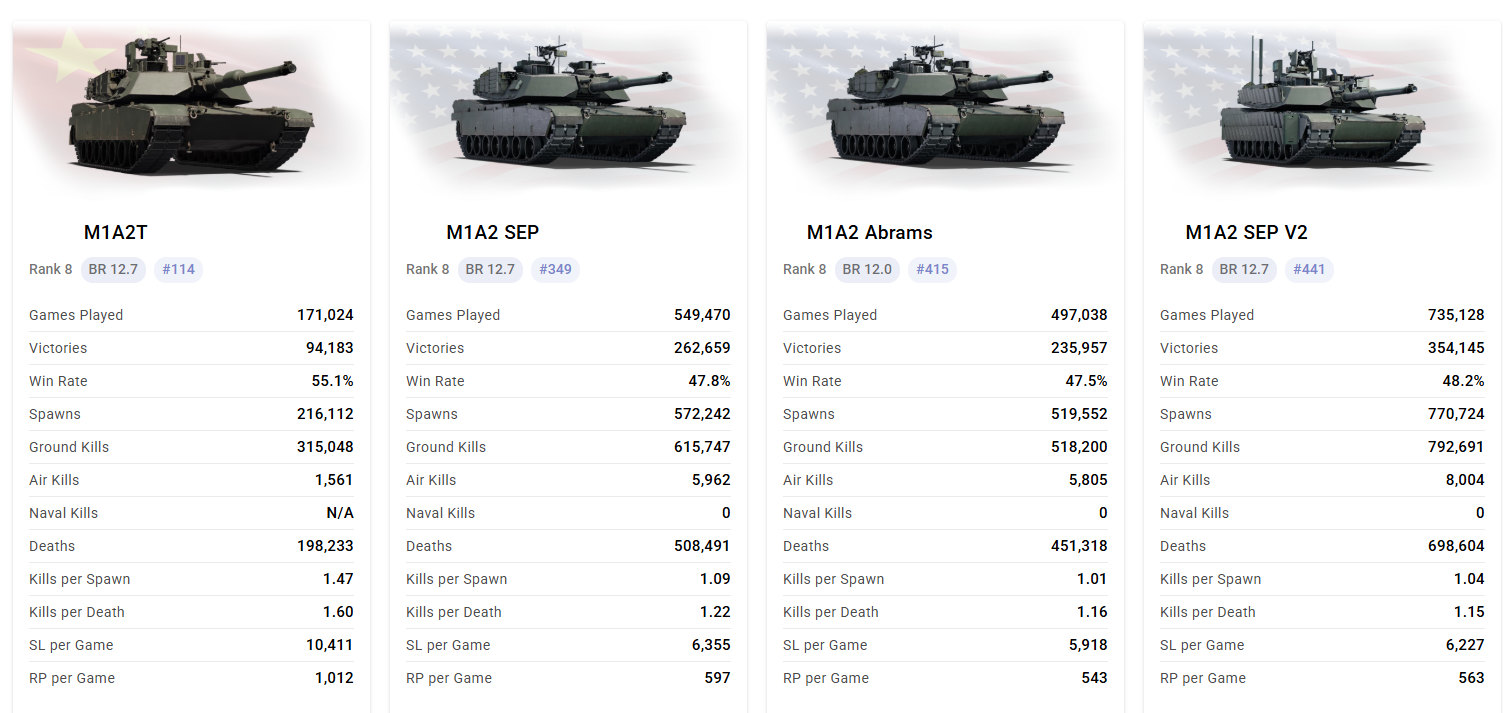 M1A2T now has the best k/d out of all top tier tanks. Compare it to the other M1A2s: