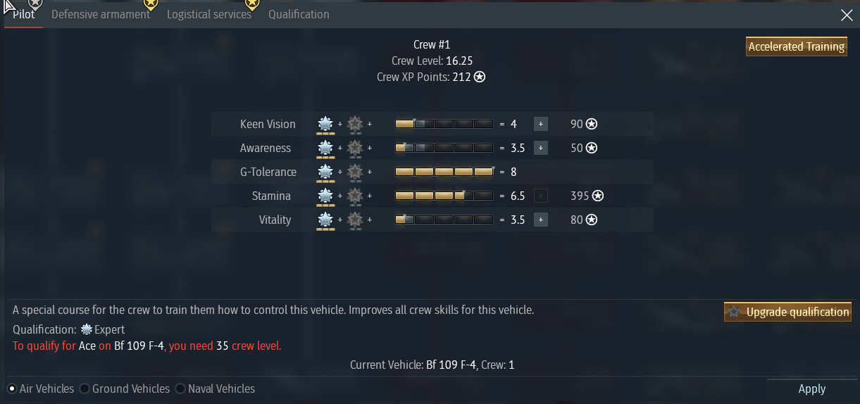 Now, if crew skills didn’t exist and we had Il2:GB style G system where everyone starts blacking out above 5G, things would have very different dynamics. Instead, we have people with semi-realistic G tolerances (a noob crew) and absurd ones (an ace max crew). Not having a maxed crew makes a significant difference.