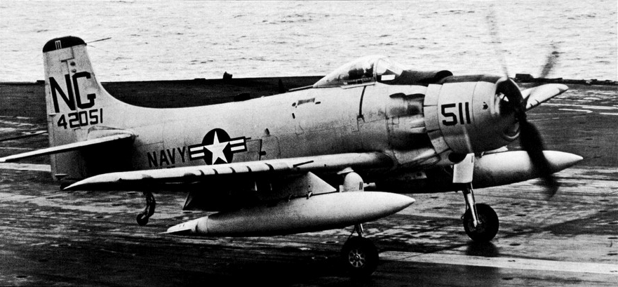 Entering service in 1946, the Skyraider—initially designated as the AD series—found its first major combat role during the Korean War. While early jet aircraft of the era were limited by high fuel consumption and fragile engines, the Skyraider’s piston-engine design allowed for the extended loiter times necessary for effective close air support. A hallmark of its Korean service occurred in 1951, when Skyraiders successfully destroyed the Hwacheon Dam using torpedoes, a feat of precision that conventional high-altitude bombing had failed to achieve.