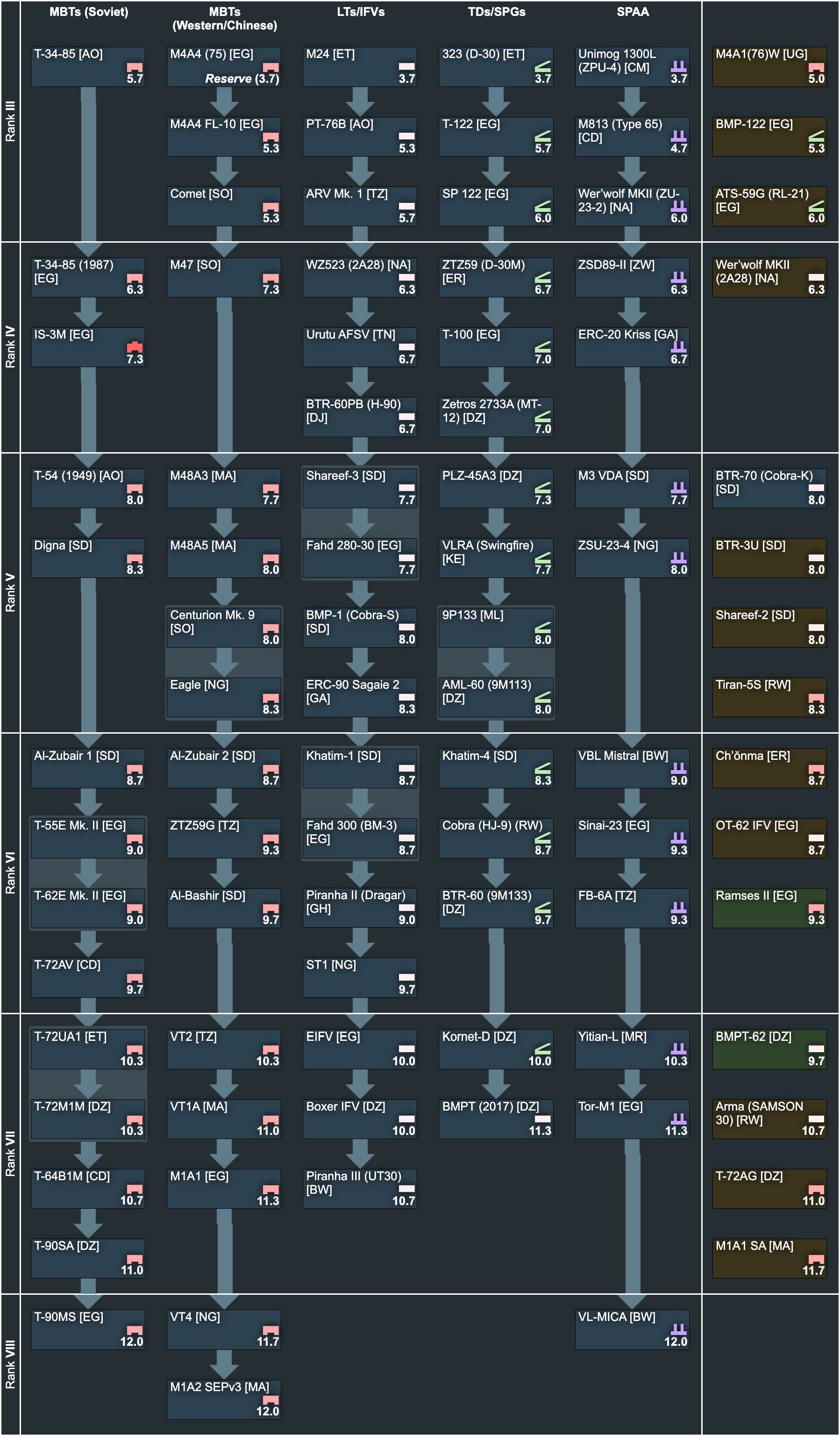 The tree is — for the most part — well-rounded across all ranks/BRs. I tried to exclude copy-paste wherever possible (see later down in the post where I list some potential additions and all the copy-paste I avoided). It starts at Rank III, as most African nations were subject to European colonialism and gained independence only during the Cold War, leaving very few vehicles suitable for Rank I and II. The only BR range I would say is lacking is 11.7–12.0, particularly as Egypt have not yet acquired the T-90MS, the M1A2 SEPv3 is copy-paste, and the VT4 is just a worse VT4A1. Unfortunately, for most African countries, their tanks are limited to Soviet T-54/55s and T-72s. However, as it will likely take some time for this tree to be implemented (if ever, I don’t have high hopes, I just found this fun), that leaves room for potential future acquisitions.