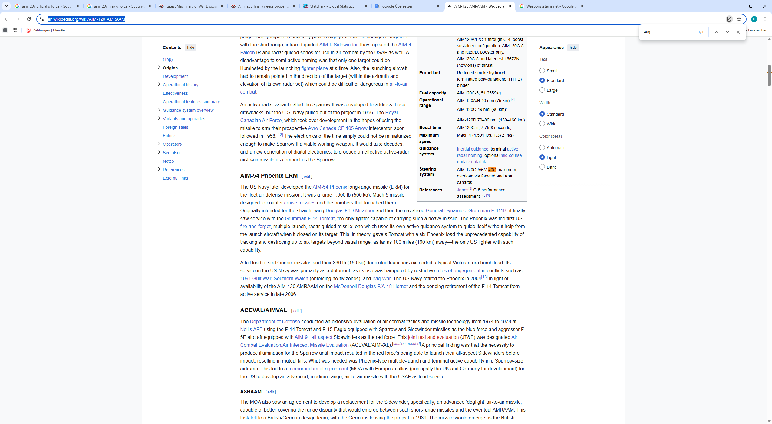 AIM-120C (C-5/6/7) up to 40 G Despite smaller (“clipped”) wings for internal transport (F-22/F-35), the G-load was increased to up to 40 G through improved actuators and software.