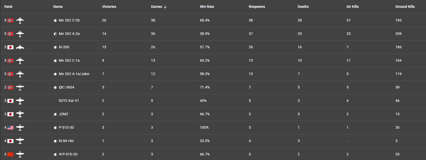 I only sorta enjoyed the Me-262C-2b, but even then I plainly recognized it was merely funny, not really effective. It was funny to see people mistake me for a standard Me-262A only for me to zoom up behind them with the rocket boosters, they mistakenly assume I’m not shooting because they see no tracers and thus don’t evade, only to blow up because I was using Stealth belts. It was funny to zoom up to B-29s and take them apart, even ones at 9km up, like no other plane easily could. But in no matches did I truly feel like I was “effective” at all - just taking advantage of stupid people. And that was the “best” 262 for air-to-air. All the others are basically enemy gunfood.