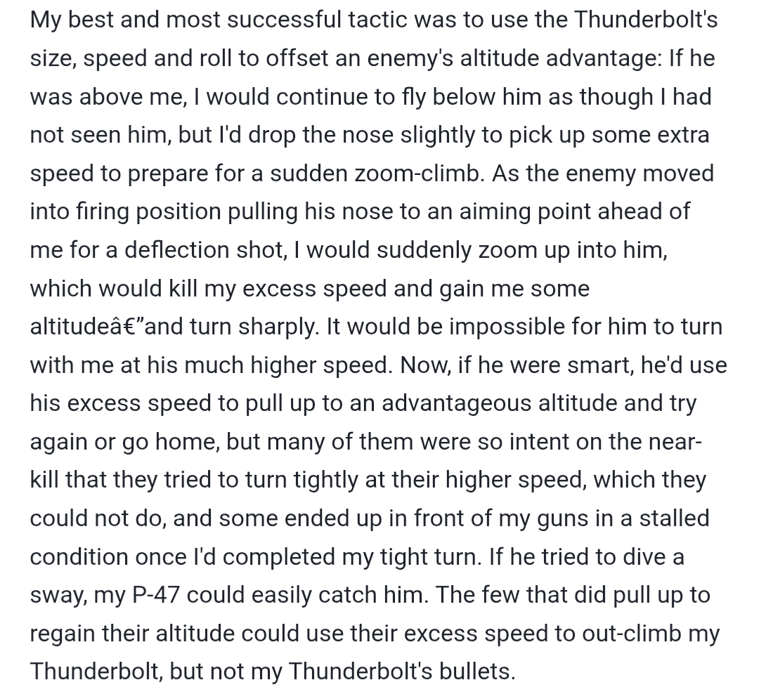 This is an excerpt from an interview with Robert Johnson, a US WW2 P-47 ace. Unfortunately this idea that heavy American fighters can zoom climb into the German experten and gun them down is a completely alien concept to some players in the sim community.