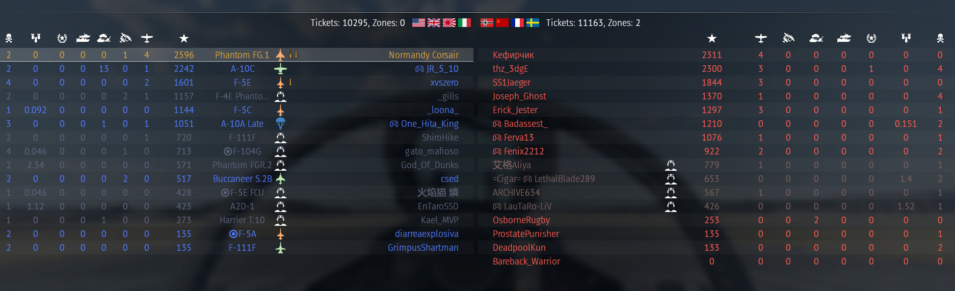 And that is the problem. Look at the active players on your team. Only 3 others are in fighters, all F-5s (none of which I think even get IFF). Imgessing most of the enemy team was in fighters like the Mig-23? I always feel like im 1v3 every single match, its annoying. Part of the reason why I dont play the Phantoms anymore