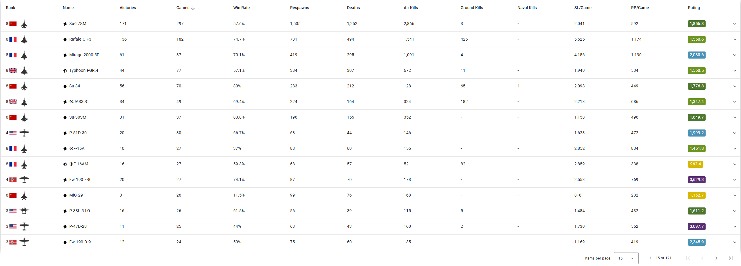Your most played plane in the past year is the F-5E FCU. You have 109 games in it, 121 deaths in it, and a KD of around 4 : 1. Lets pay attention to the deaths for a second; 121 deaths spread out over 109 games equals 1.1 deaths per game.