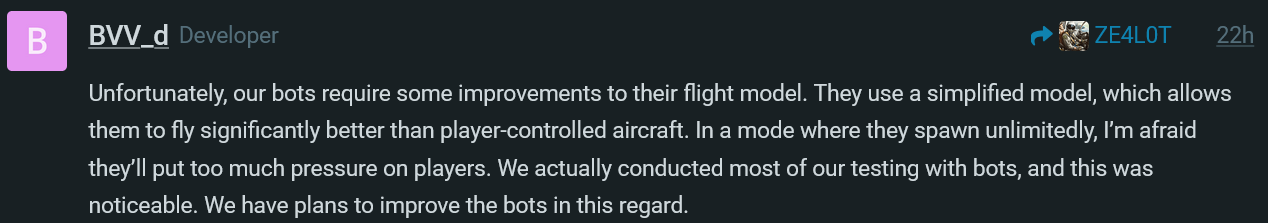 It 's not directly related, since this is abt the " named bots " that fill spots in unbalanced queues. But since the presense of the ai behaviours for player-controlled carrier airgroups in the files is one of the oldest and most solid evidence that development for player AC 's has begun and is ongoing, it 's possible that improvements in that related area of the game 's development might bleed back into this one.