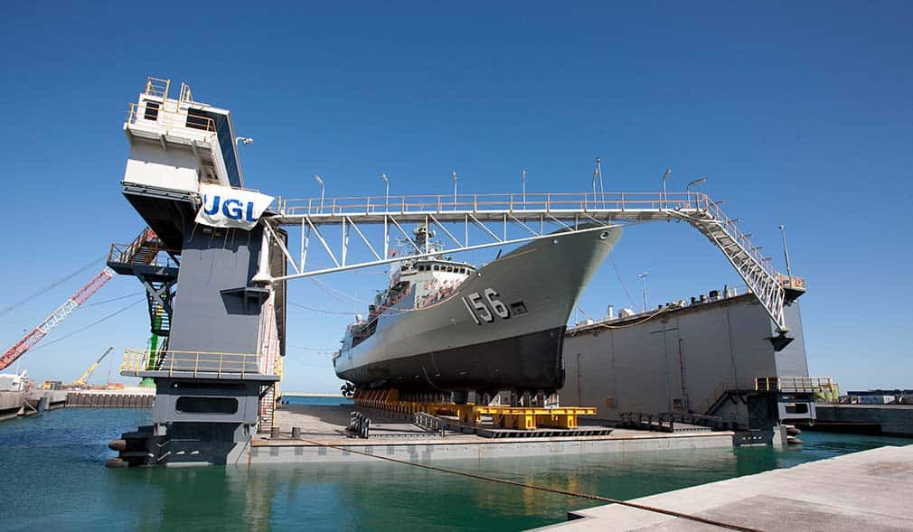 HMAS Toowoomba in a floating dry-dock for maintenance, 2019