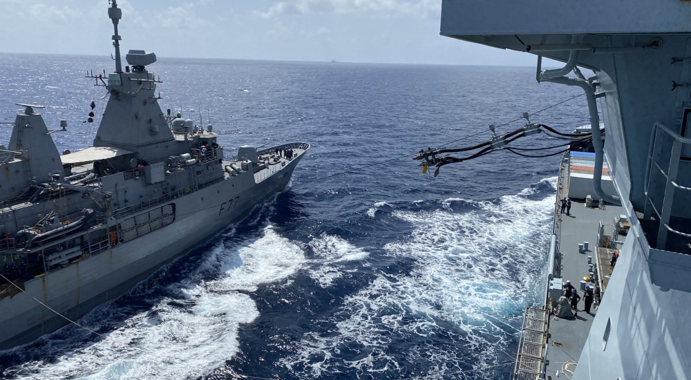 HMNZS Te Kaha refueling from RFA Tidespring as part of the UK CSG, 2025