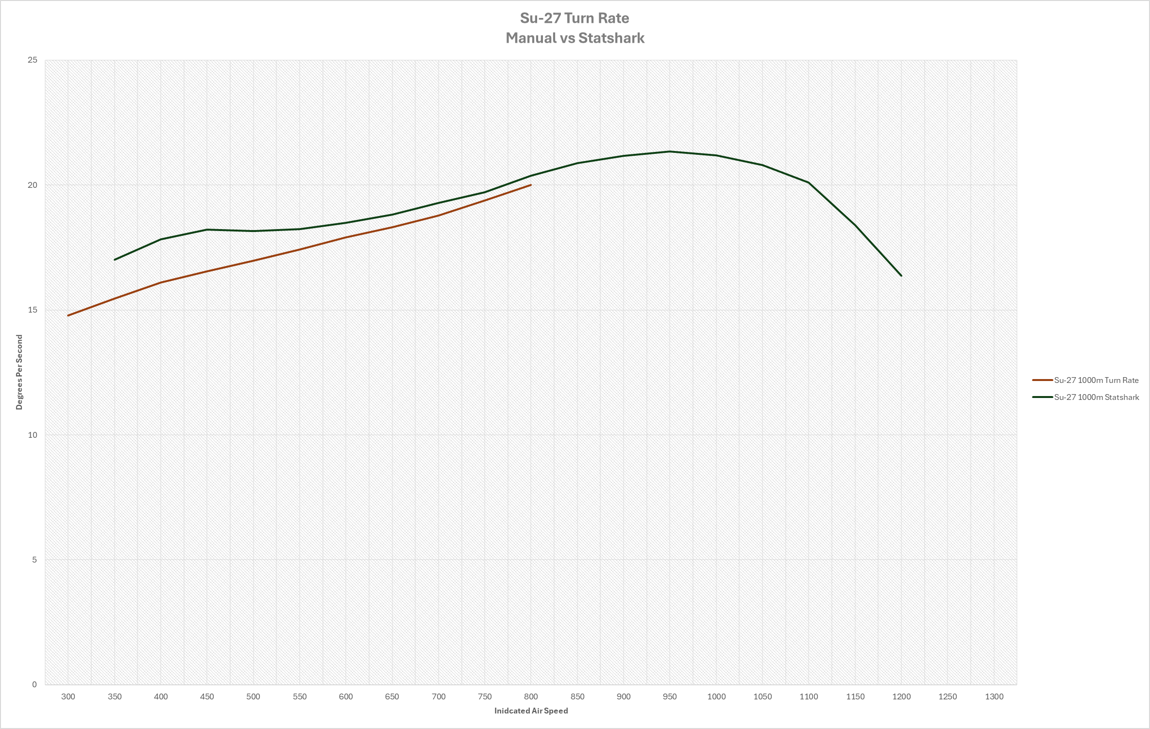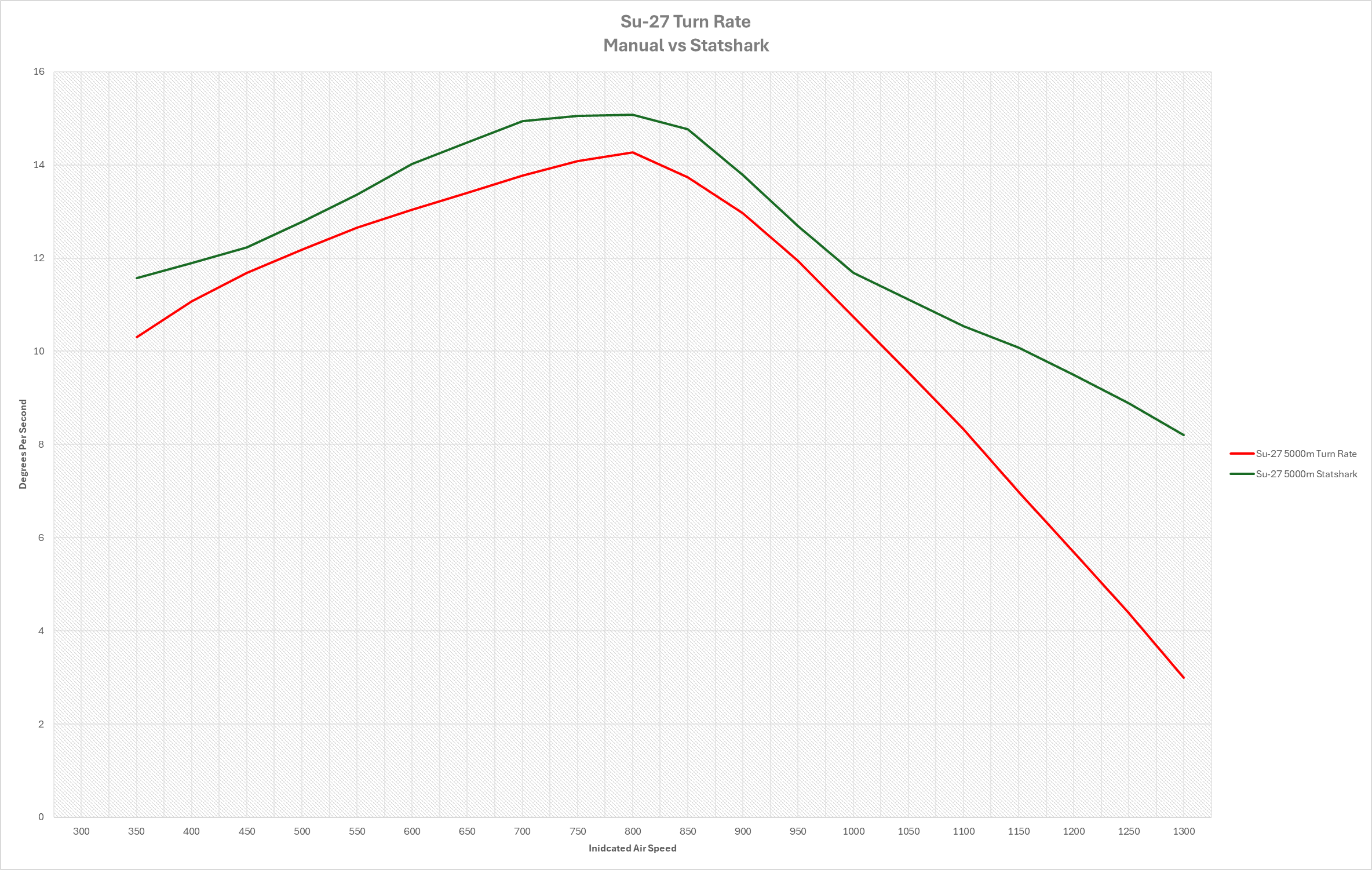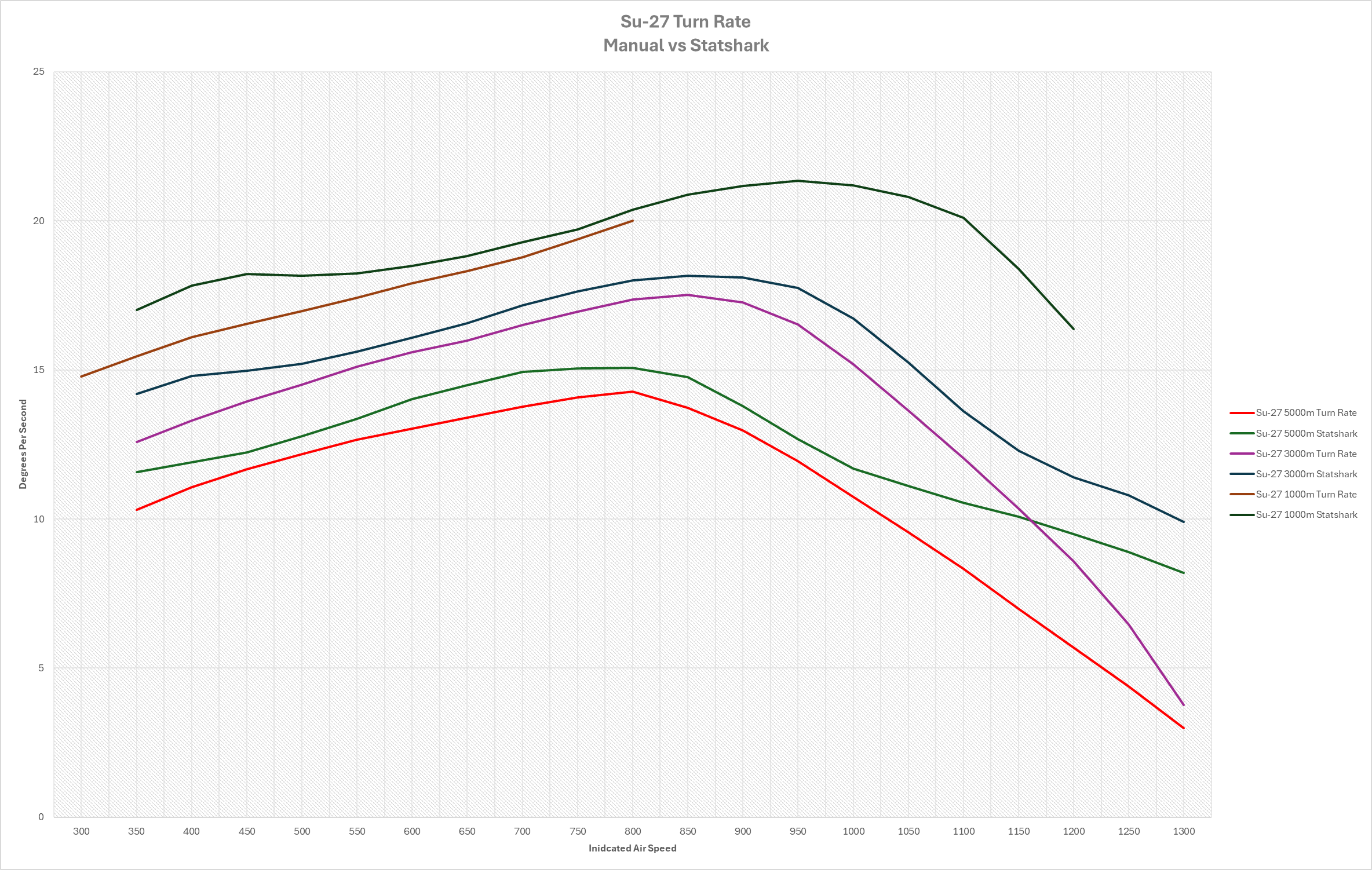 The relationship between the 3000m figures is going to be similar to figures at all altitudes. First off the planes STR is overperforming across the board. It is off by around 1/2 degree per second at it’s close figures when compared to Statshark; however it should be noted that the Statshark estimation for the Su-27 is probably underestimating the turn performance by .5 to 1.5 degrees per second as well depending on the speed range.