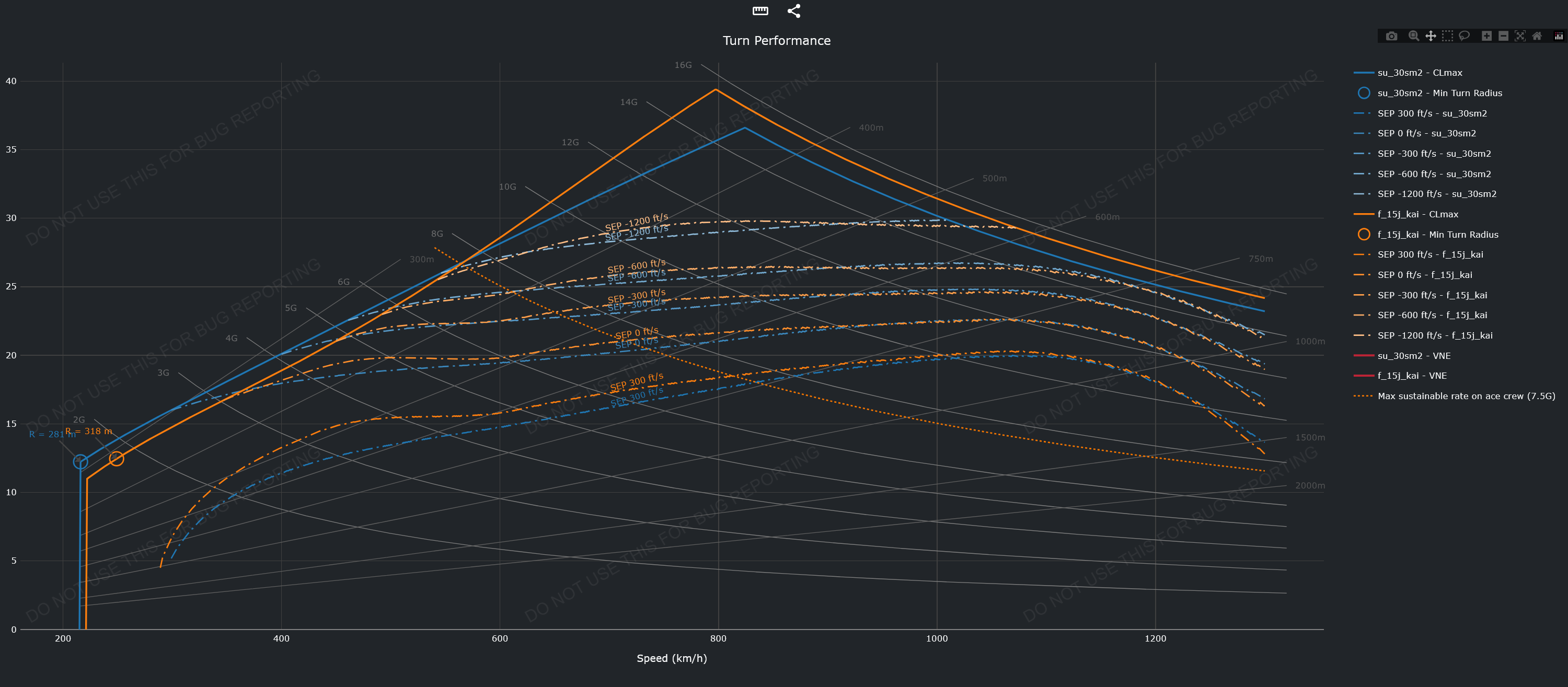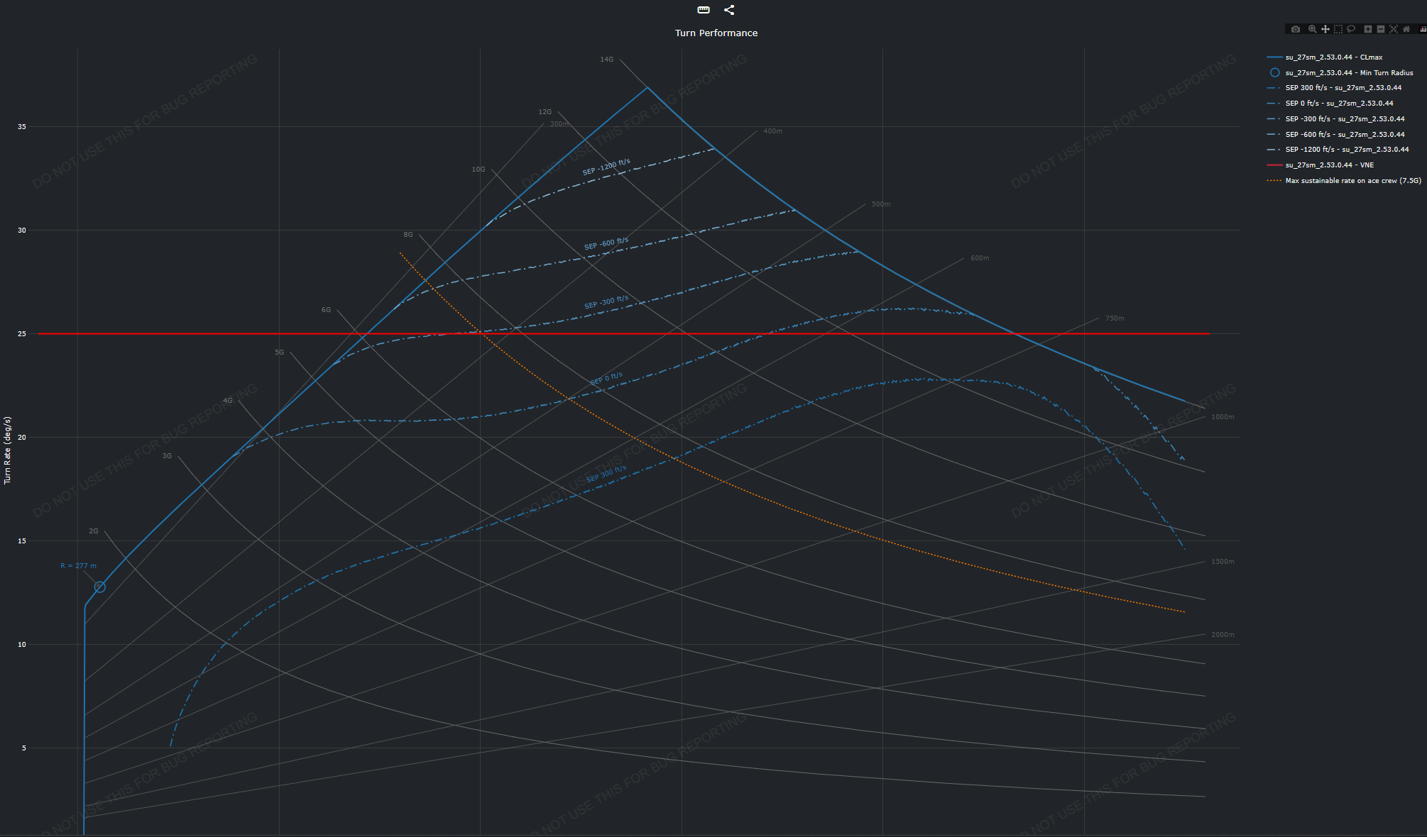 Doing a very consistent sustained turn rate at high speeds is hard, you need to disable pilot blackout (or have ace crew), and with mouse aim on full controls is hard to keep the exact same altitude (because if you start climbing or descending you loose/gain turn rate or speed) and to keep the same pull, specially the flankers don’t pull linearly so its extra hard.