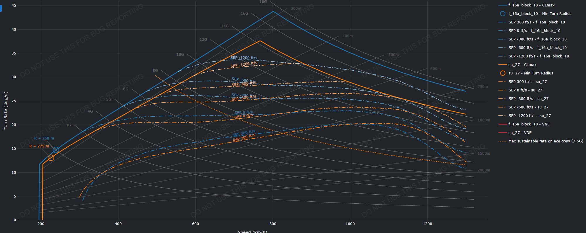 Even if you think my test has issues because of some data pulling issue with WTRTI. Take a look at this Statshark graph and consider that the base Su-27 will beat the F-16 block10 rate at any speed in the actual game.