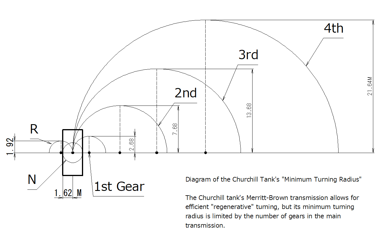 Look at this diagram. It illustrates the minimum turning radius of the Churchill tank. This tank uses regenerative steering when turning, allowing it to turn at the same speed as when traveling straight. However, the turning radius is limited to a certain value. The permitted turning radius is determined by the number of gears selected by the driver in the main transmission.