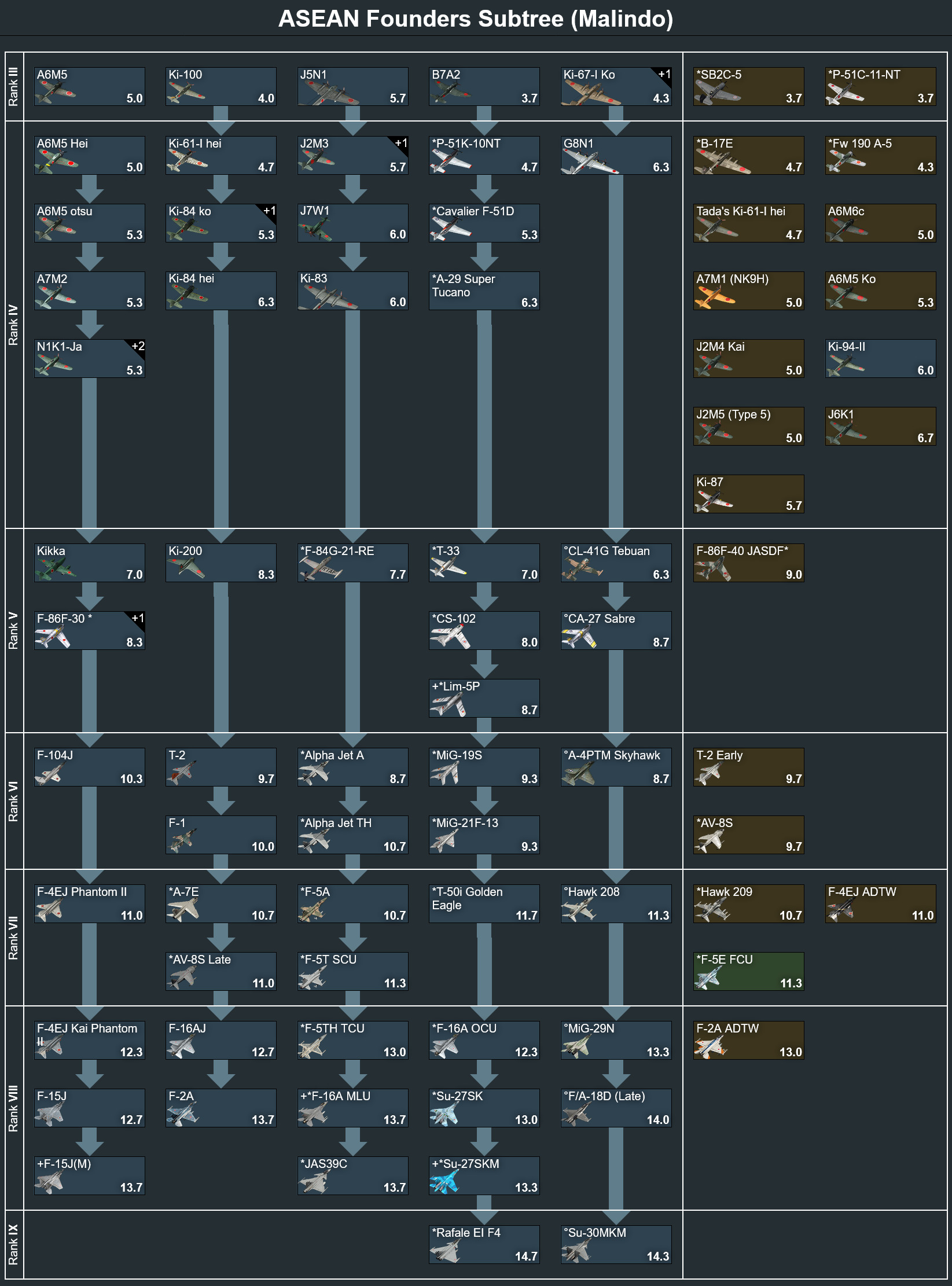 added Super Tucano after Cavalier, new rank 5 lineup including CS-102 and T-33, added MiG-19S before MiG-21F-13, and moved Malaysian jets deemed feasible on line 5. And the brand new Rank 9 bracket moved down MKM and Rafale. Again, no more F-5E from MY or ID shall be added given FCU and SCU made them redundant.