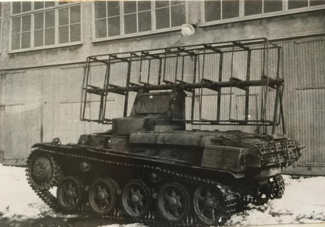 Stridsvagn m/41 (Strv m/41) of Landsverk manufacture with a launch frame for eleven SS.10 (Swedish: Robot 51) ATMGs.