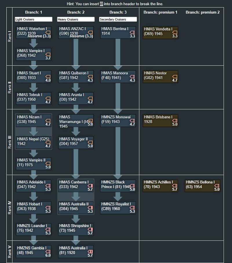 The tree is separated into three main lines, Light Cruisers, Heavy Cruisers, and Secondary Cruisers, they have a BR span from 3.3-6.0 and include ranks 1-5. The BRs for each vessel have been arranged to the best of my ability, but they are mostly used to direct the flow of the tree. There are 30 Australian and New Zealand vessels in the tree and premium lines, as explained above.