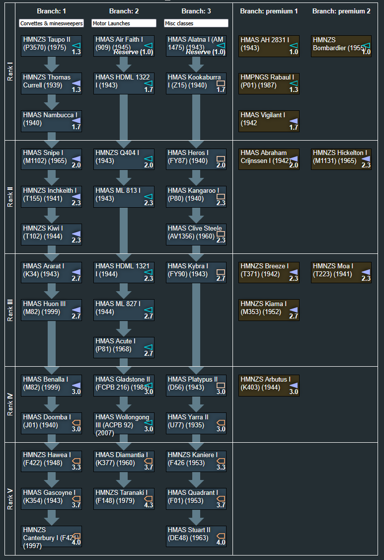 The tree is separated into three main lines, Corvettes & Minesweepers, Motor Launches, and Auxiliary, they have a BR span from 1.0-4.0 and include ranks 1-5. The BRs for each vessel have been arranged to the best of my ability, but they are mostly used to direct the flow of the tree. There are 43 Australian and New Zealand vessels in the tree and premium lines, as explained above. Not all vessels in this tree did carry the ‘HMAS’ or ‘HMNZS’ moniker, however they have been added for clarity with the vessels operator. For example the ‘HMAS Clive Steeele’ as it is in the tree, wasn’t a commissioned RAN vessel, and as such did not carry the ‘HMAS’, instead it carried ‘Australian Landing Ship’, as it was an army vessel.