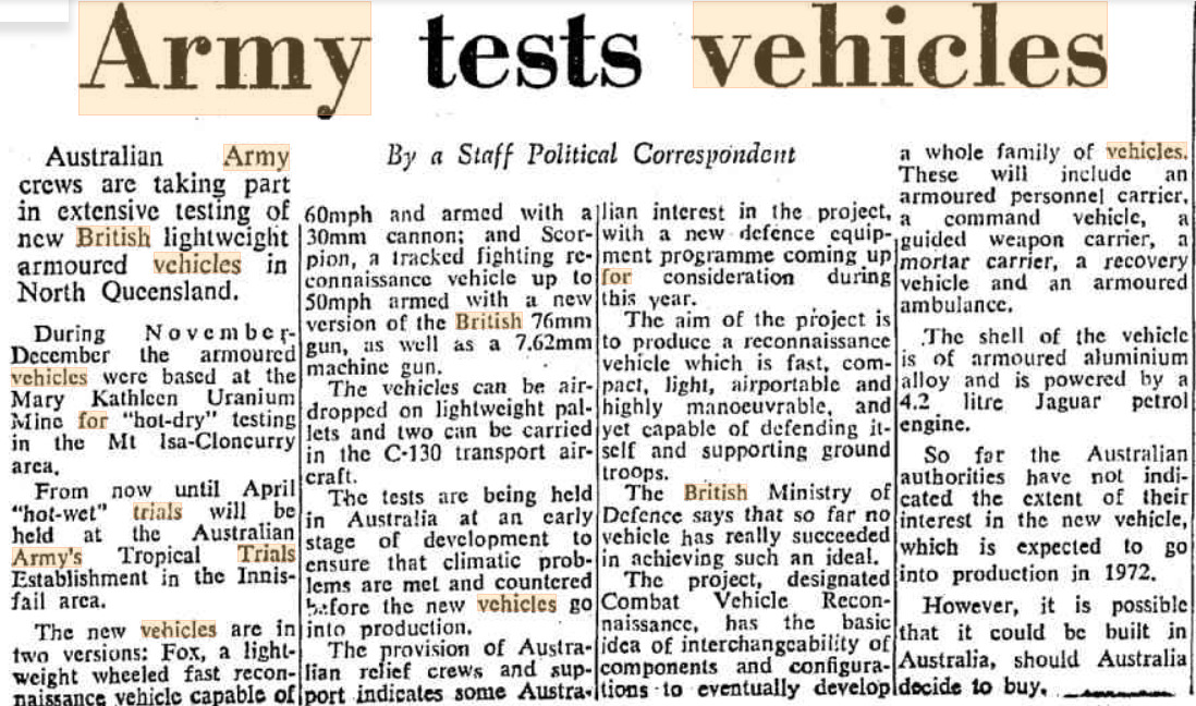 So it has been discovered that the Australian army trialed a Fox (already knew about the Scorpion). I should probably add it to the suggestion at some point.