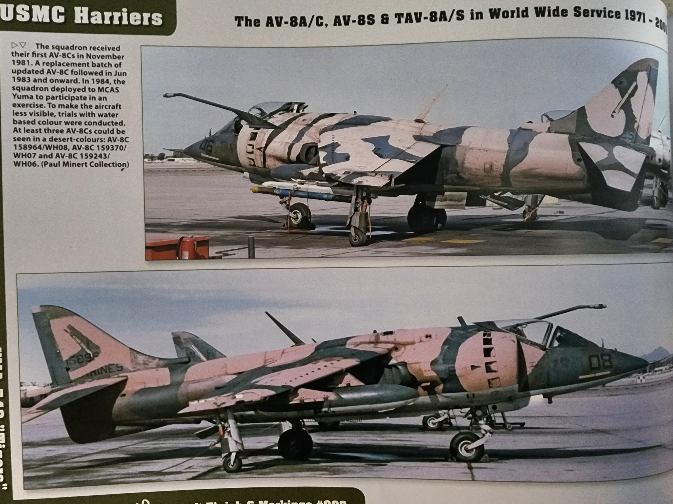 So, a new book of mine about the Harrier (specifically in reference to liveries/camo schemes) finally arrived. While I found nothing new regarding actual photos of the AV-8C’s CMDs, I did come across this fascinating image of an AV-8C in a very unique temporary camouflage (using water-based paints)…