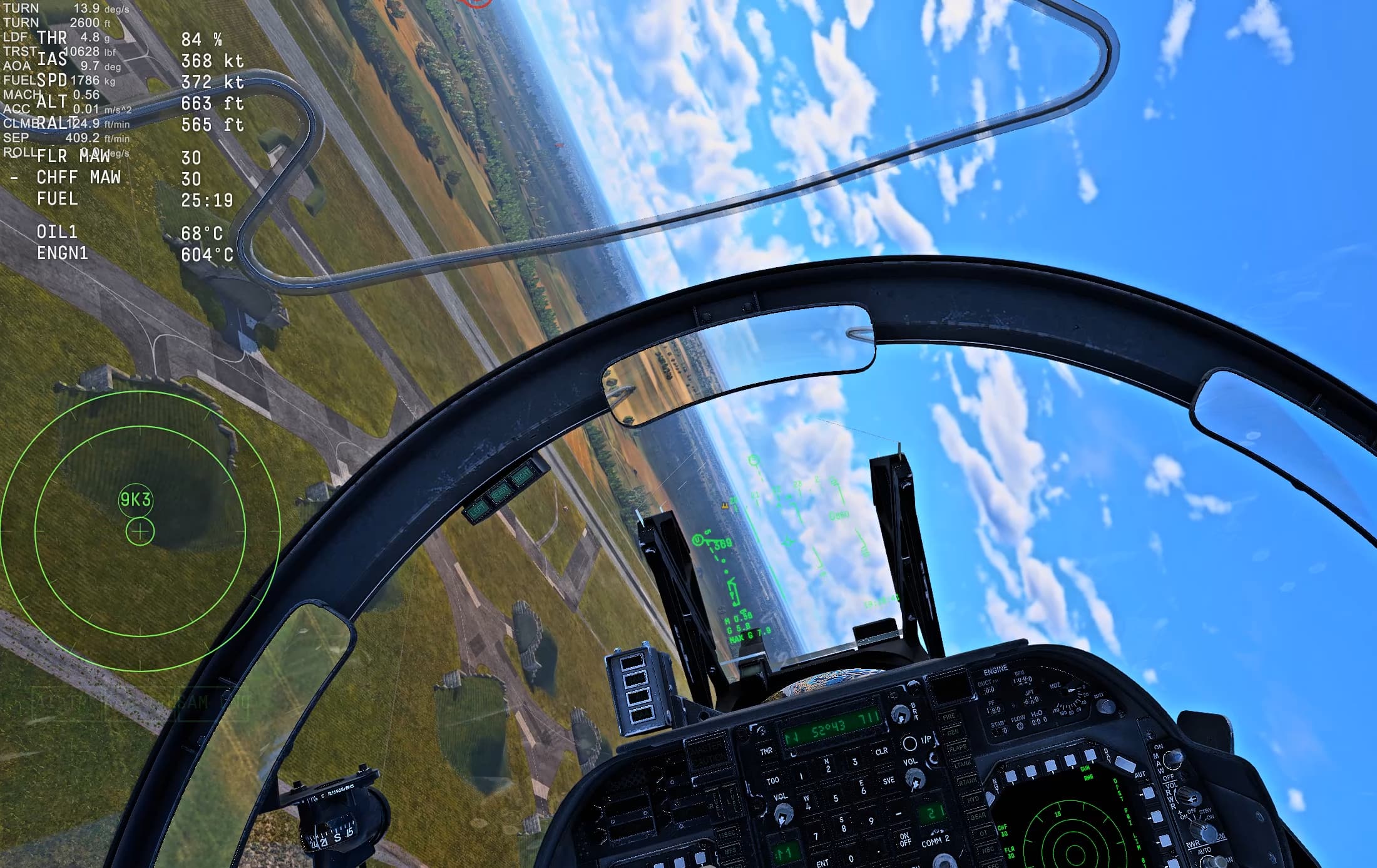 turn starts at 0:31 where the runway is seen behind the aircraft and at 0:52 it can be seen in front of the aircraft at the end of a 360 degree turn. It takes the Gr.7 approximately 21-22 seconds to complete the max rate turn. The turn rate is 17-16 degrees per second. This matches perfectly to the 6G at 370 knots figure.