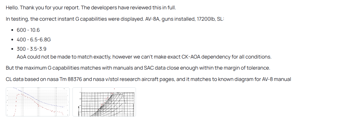 So just to clarify, The Operating data manual, CA RtoS document, NASA TM reports, The AV-8A manual, and the sea harrier BAE report were all reviewed, and the devs decided that 1 chart with undefined terms was correct.