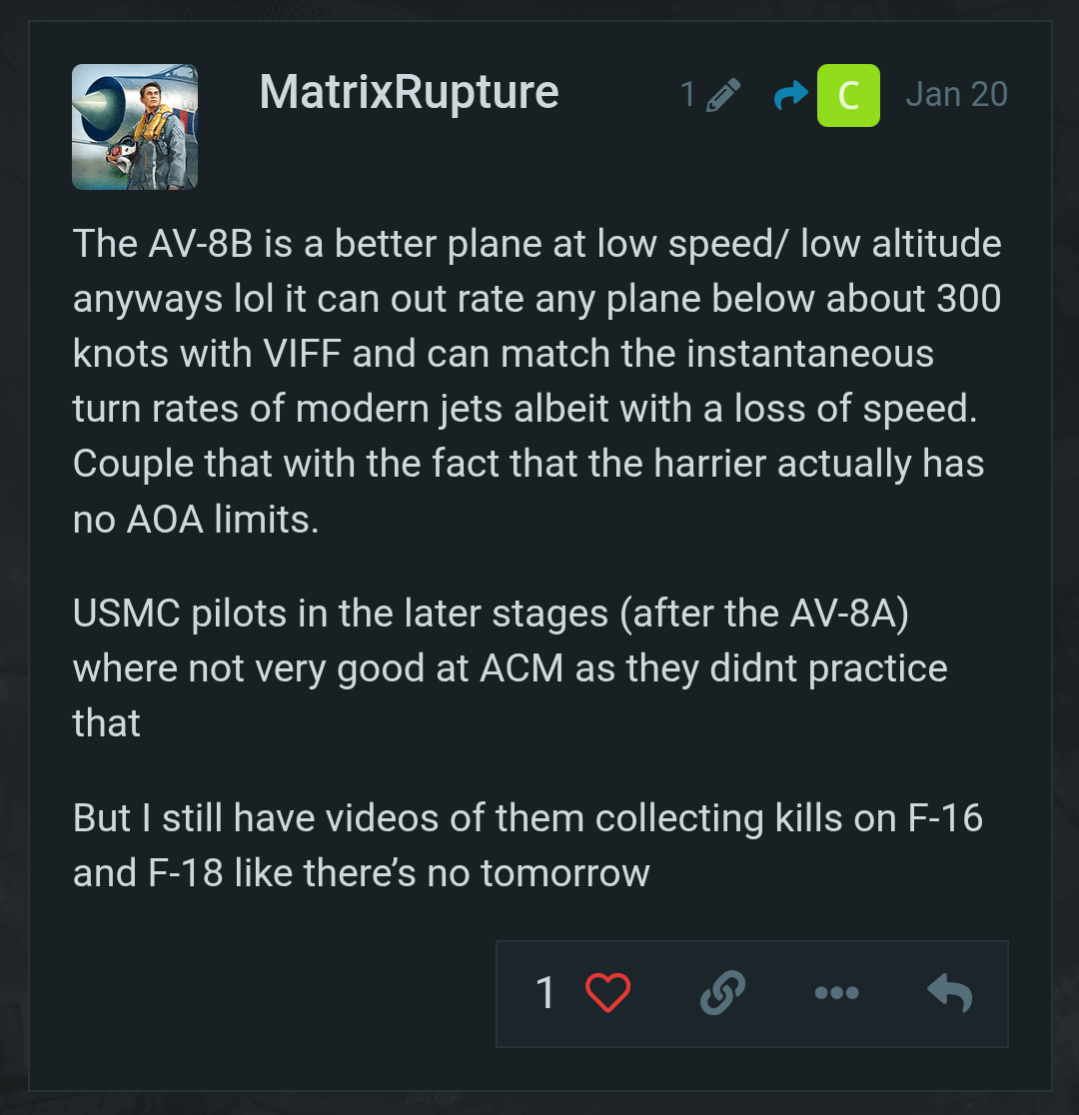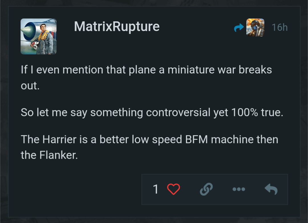I’m sure everyone that has paid attention in any thread has seen you endlessly claiming that the Harrier is a better dogfighter than more or less any 4th Generation plane out there.
