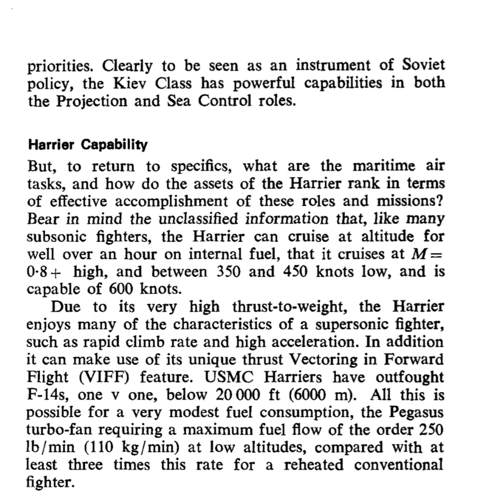Admiral Zumwalt has even confirmed that the AV-8A has out fought F-14s when starting from 20,000 feet and below.