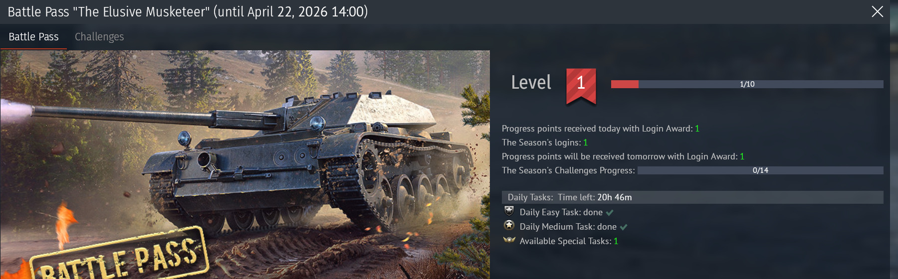 La Saison 22 du Battle Pass est dédiée aux courageux Mousquetaires célébrés par Alexandre Dumas. Obtenez des décalcomanies avec les noms des Mousquetaires et des décorations mettant en valeur leurs armes, un emblème de mousquetaire, et un cadre doré digne de la royauté! En outre, n’oubliez pas les véhicules, dont la récompense principale est le char léger français ELC 901, rapide, maniable et vraiment insaisissable! Et pour les aéronefs, le J30 Mosquito suédois! Comme toujours, des Warbonds, des bonus, des Silver Lions, du temps de compte Premium, des Paris et bien plus encore vous attendent.