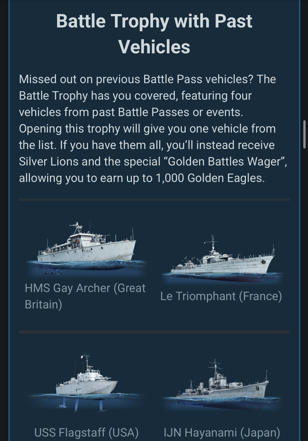 Missed out on previous Battle Pass vehicles? The Battle Trophy has you covered, featuring four vehicles from past Battle Passes or events. Opening this trophy will give you one vehicle from the list. If you have them all, you’ll instead receive Silver Lions and the special “Golden Battles Wager”, allowing you to earn up to 1,000 Golden Eagles.