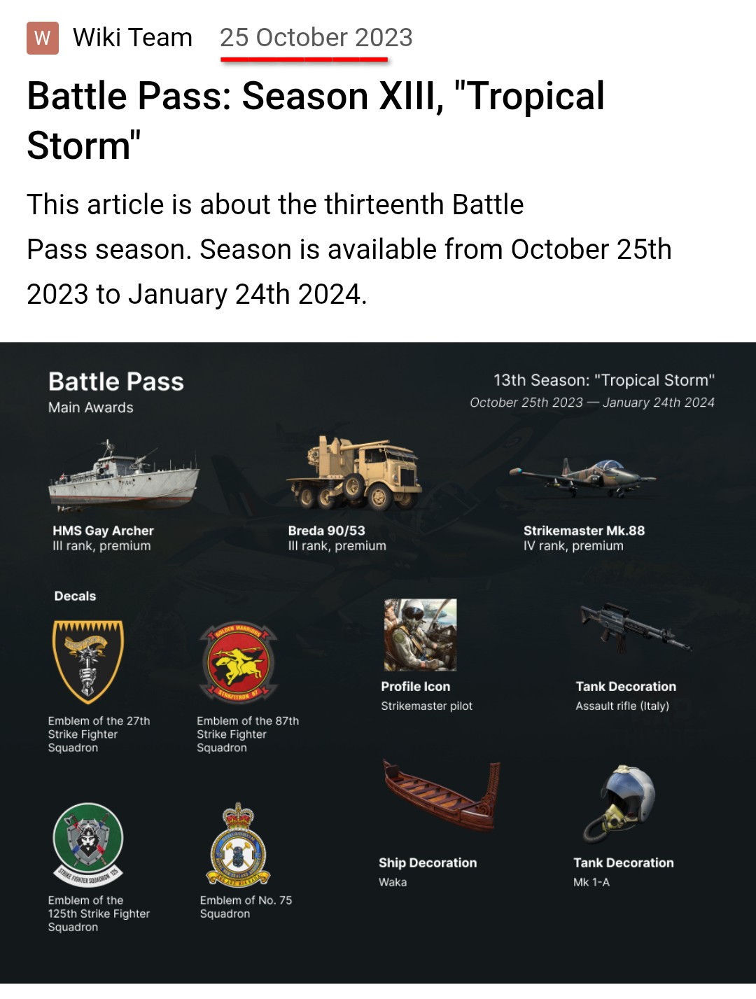 Season 23 of the Battle Pass celebrates Greece! Get decals featuring Air Force unit emblems, the Royal Hellenic Navy flag, decorations featuring an ancient Greek sword and helmet, and a profile icon of Steve Pisanos, a Greek pilot who flew Spitfires in the Second World War with the American Volunteer Squadron. The main vehicle reward is a premium Spitfire LF Mk IXc with a clipped wing in the Royal Hellenic Air Force livery, along with the Japanese destroyer Suzutsuki. As always, the Battle Pass offers War Bonds, boosters, Silver Lions, Premium account days, wagers, and much more.