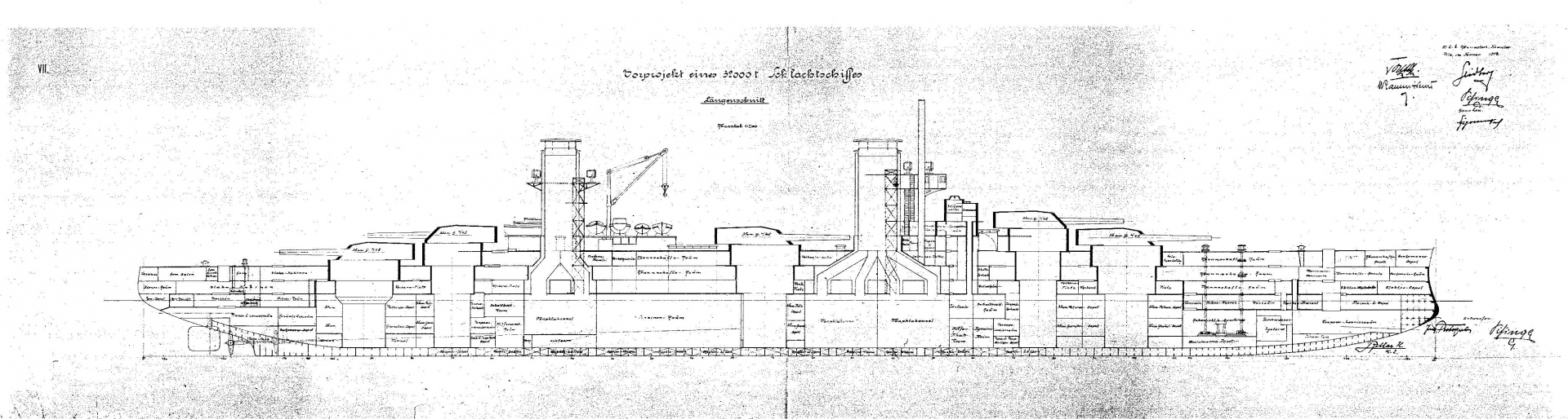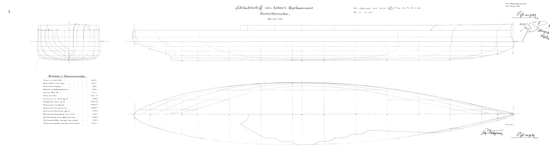 After several additional requirements were given to the MTK (as well as a request for a sketch of a 29,000t and 32,000t design), Pitzinger presented his near final design on August 4th, 1913. Several more design tweaks were added before the costs were approved by the Council of Ministers in October 1913, at which point debates with the shipyards as to price of construction began. After a particularly heated debate on December 1st, 1913, detailed work on the full construction plans began. Once again, several design tweaks were added over the following months, and with additional armor added at the sacrifice of some of the 15cm cannon, the design was ready for construction. The only remaining factors were the approval of the delegations - which came in May of 1914 - and the results of the underwater test.