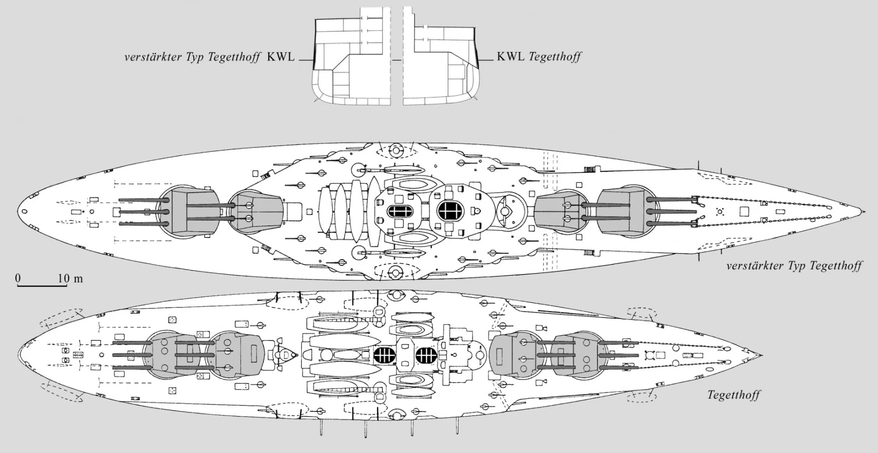 A comparison image between the “improved Type Tegetthoff” (Ersatz Monarch) and the Tegetthoff-class.