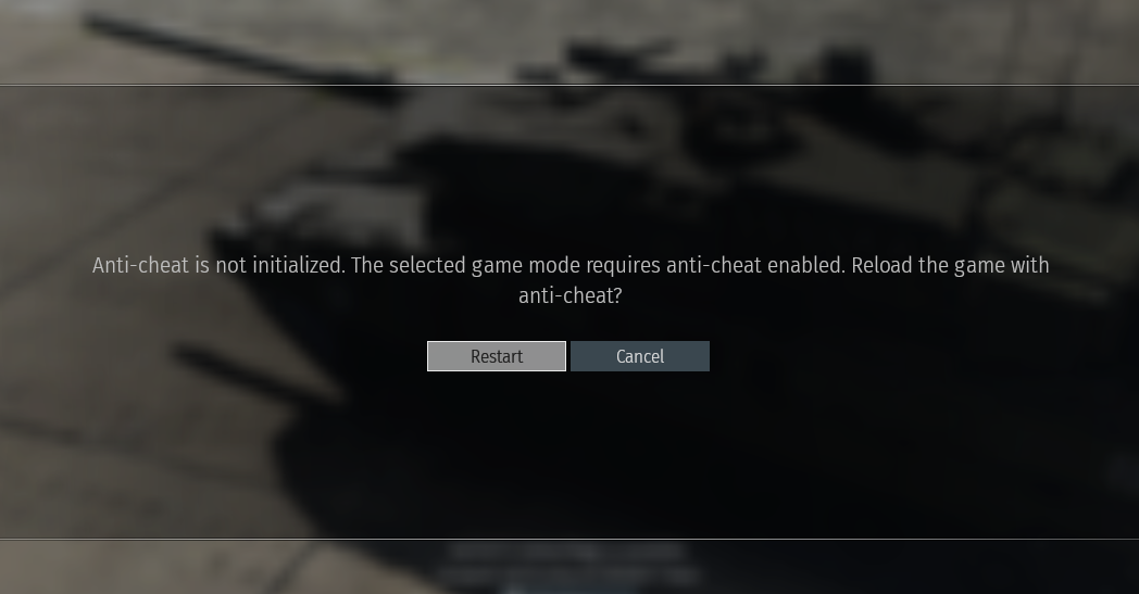 Hey everyone, after the release of the new update “Tusk Force” i cant load up into a match because it says anti cheat is not initalized This mode requires Anti cheat etc. And it gave me an option to restart the game so the anti cheat activates. After i did that i tried to start a match but nothing changed the same message pops up