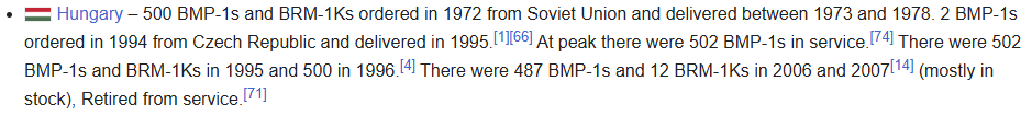 What the world came to. Wikipedia is in fact a good place to gather sources, these small numbers are citations directly to sources, matter of fact there are one stating Czech exportation of BMP-1 IFVs to Hungary such as: