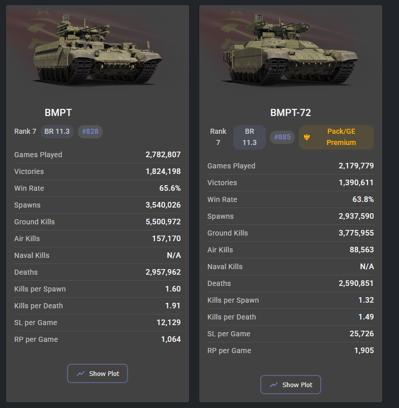 Still remains an insult that gaijins greed has allowed these tanks to stay as they are. They ignore feedback and “look at stats” and then watch as the BMPT has skyrocketed up to the top and just let it remain there ruining everything between 10.3-13.0.