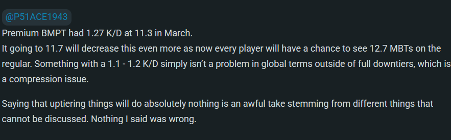 Did I say uptiering it would do absolutely nothing? No. I dislike your passive-aggressive attitude and to reiterate my point, it shouldn’t be able to see any vehicle in the 10.0 BR bracket. Like you said it’s a compression issue as well. I even stated in a different post that the BMPTs going to 11.7 would help but it wouldn’t completely alleviate the damage done to the BR bracket.