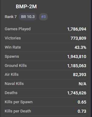 Player-stats are influenced by various factors and can/should never be taken as a sole and definite metric for a vehicles’ strength.