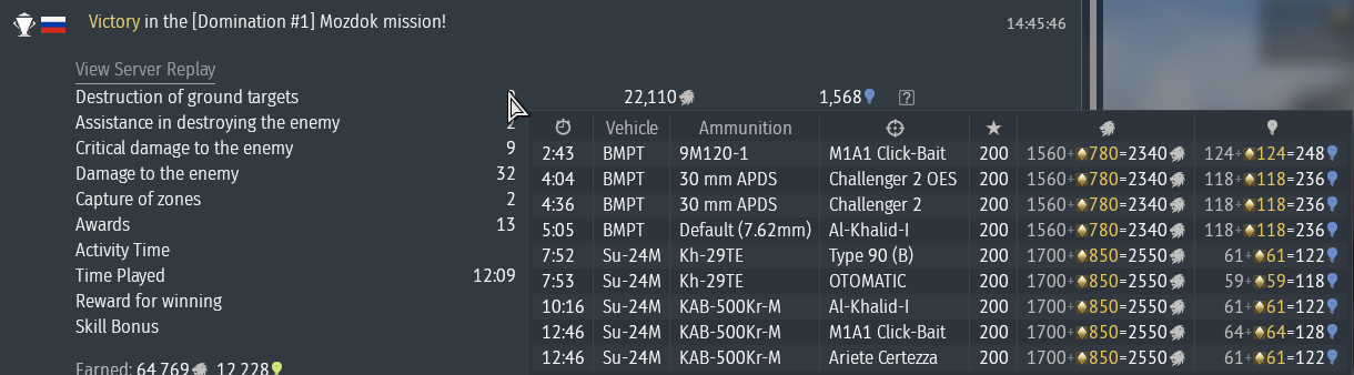 To be fair i did die twice in the BMPT, once after getting caught out of position and second time after killing 4 tanks before finally dying to a challenger that manifested from the wall. That being said, the fact you can use better CAS now without any BR penalty… well i give it like 1 or 2 days before you start seeing 11.3 games with BMPT, Ka50 and Su39. Good luck