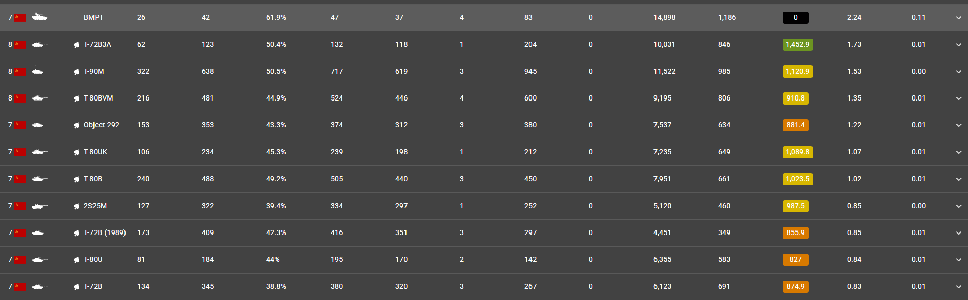 and yet clearly BMPT, vehicle you claim you dont know why people call overpowered, is outlier when compared to all of your other russian vehicles, both in KD and winrate.